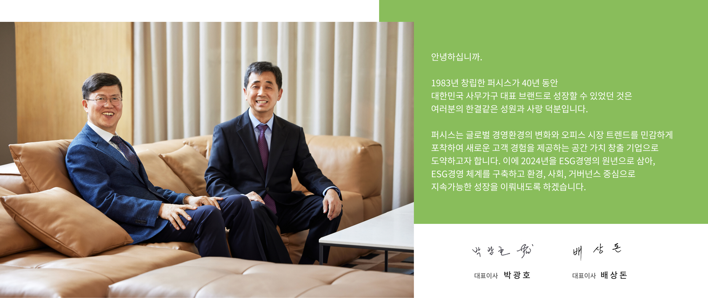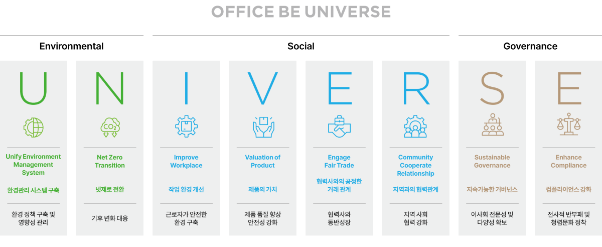 - 퍼시스는 2024년 4월, ESG경영 비전인 ‘Office be Universe’를 수립하고 체계적인 ESG경영에 대한 의지를 표명했습니다.