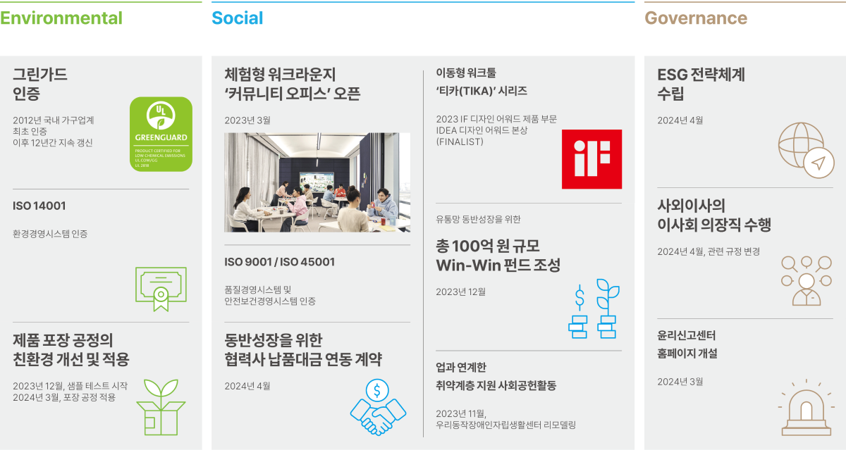2005년에 생산되는 전 제품에 대하여 환경부에서 환경 친화적인 상품 보급과 기술 개발을 장려하기 위해 제정된 환경마크 인증을 획득하였으며, 현재까지 인증 획득 및 연장을 지속하고 있습니다. 또한 국내 최초로 친환경 제품에 관한 최고 권위의 인증 프로그램인 그린가드(GREENGUARD)를 취득하였으며 총 96개 제품이 기준을 준수한 제품으로 인증받았습니다.