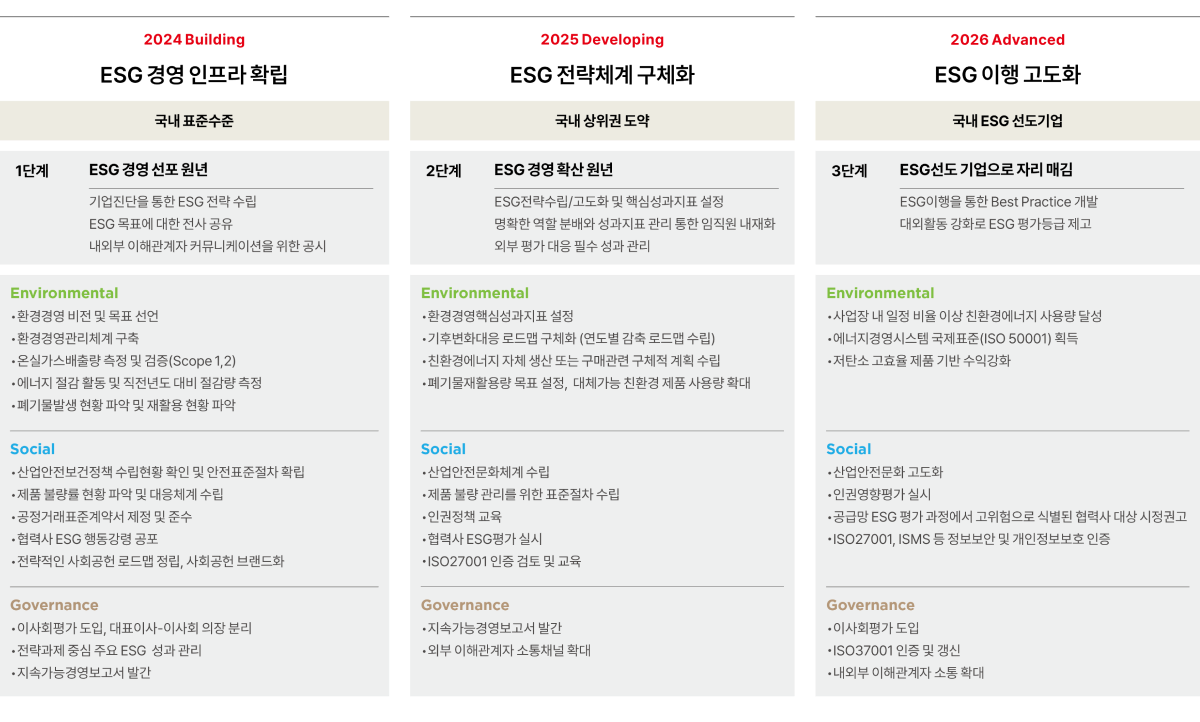 2024년까지 ESG경영 인프라를 확립하고, 2025년까지 ESG전략 체계를 구체화, 2026년에 ESG 이행을 고도화하는 3단계 전략을 실행할 계획입니다.
